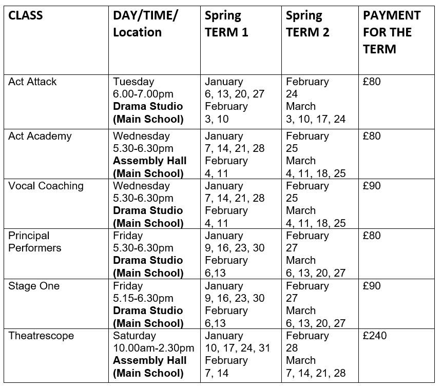 Our weekly classes run during the term time, usually for 12 weeks in each term (sometimes 11 and sometimes 13 weeks). Fees are paid termly in advance. All of our classes work towards end of term performances for our showcase evenings.